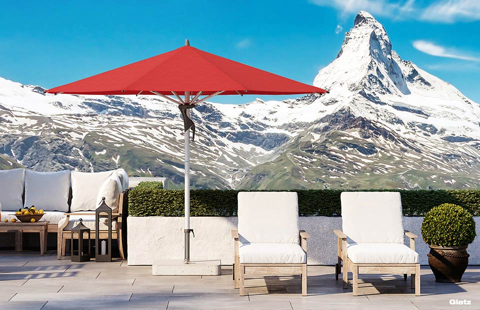 Im geöffneten Zustand hält der Sonnenschirm, je nach Grösse und Befestigung, bis zu 60 km/h Wind stand.