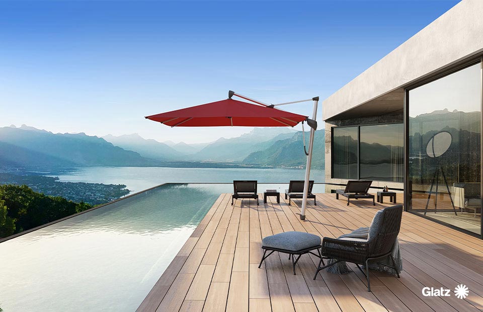 Der SOMBRANO® überzeugt mit gutem Design, Qualität, Funktionalität und einfacher Handhabung. Beim Kurbeldrehen öffnet sich der Sonnenschirm nicht nur, sondern richtet sich gleichzeitig automatisch horizontal aus. Mit der am Mast angebrachten Lenkstange kann das Schirmdach auf beide Seiten bis zu 54° in 18°-Schritten geneigt und in der gewünschten Position arretiert werden. Zusätzlich lässt sich der Sonnenschirm dank kugelgelagertem Drehfuss bequem 360° um die eigene Achse drehen.